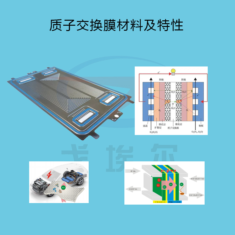 質子交換膜或聚合物電解質膜(PEM)是一種半透膜,通常由離聚物制成,旨在傳導質子,同時充當電子絕緣體和反應物屏障,如氧氣和氫氣。當它們組合成質子交換膜燃料電池或質子交換膜電解器的膜電極組件(MEA)時,這是它們的基本功能:分離反應物和傳輸質子,同時阻斷通過膜的直接電子路徑。質子交換膜可由純聚合物膜或復合膜制成,其中其他材料嵌入聚合物基體中。杜邦公司生產(chǎn)的含氟聚合物(PFSA)Nafion是最常見的市售PEM材料之一。雖然Nafion是一種像PTFE一樣具有全氟骨架的離聚物,但還有許多其他結構單元可用于制造質子交換膜的離聚物。許多使用聚芳族聚合物,而另一些使用部分氟化的聚合物。質子交換膜的主要特性是質子傳導率()、甲醇滲透率(P)和熱穩(wěn)定性。質子交換膜燃料電池使用固體聚合物膜(薄塑料膜),當其被水飽和時,質子可透過,但不傳導電子。